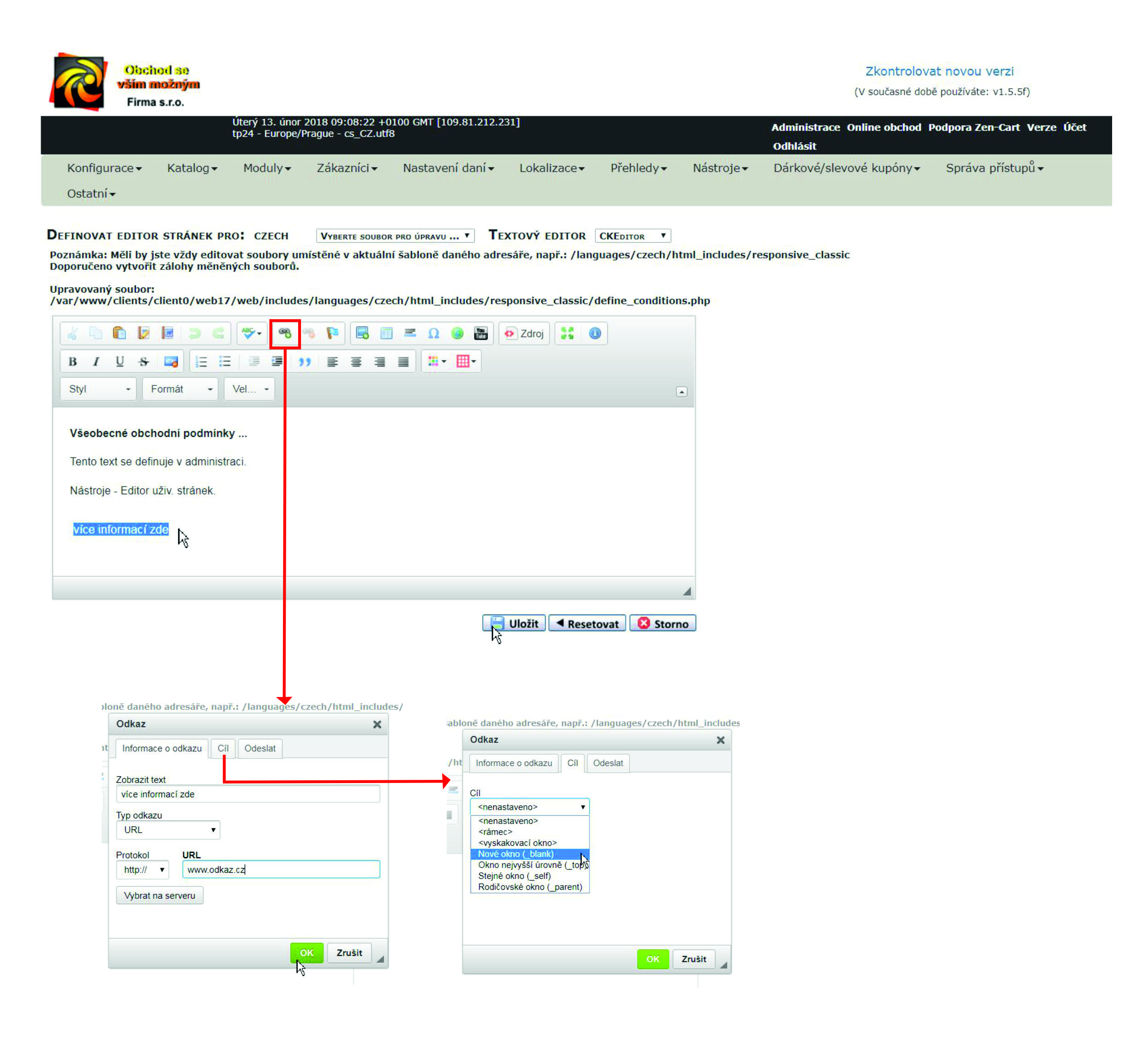 Chceteli text provázat s odkazem na jiné stránky označte text (např.: více informací zde) a klikněte na ikonu odkaz viz obrázek víše.