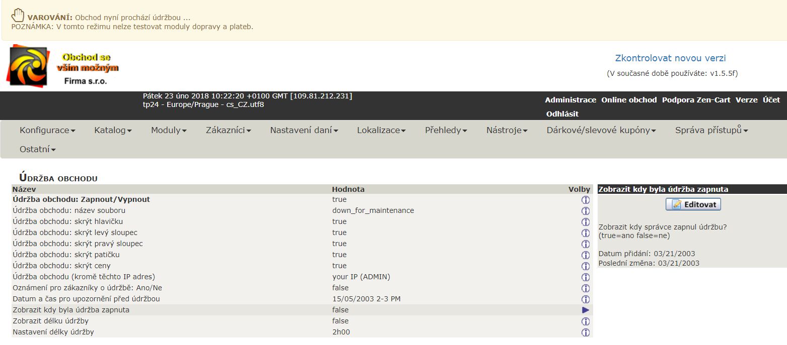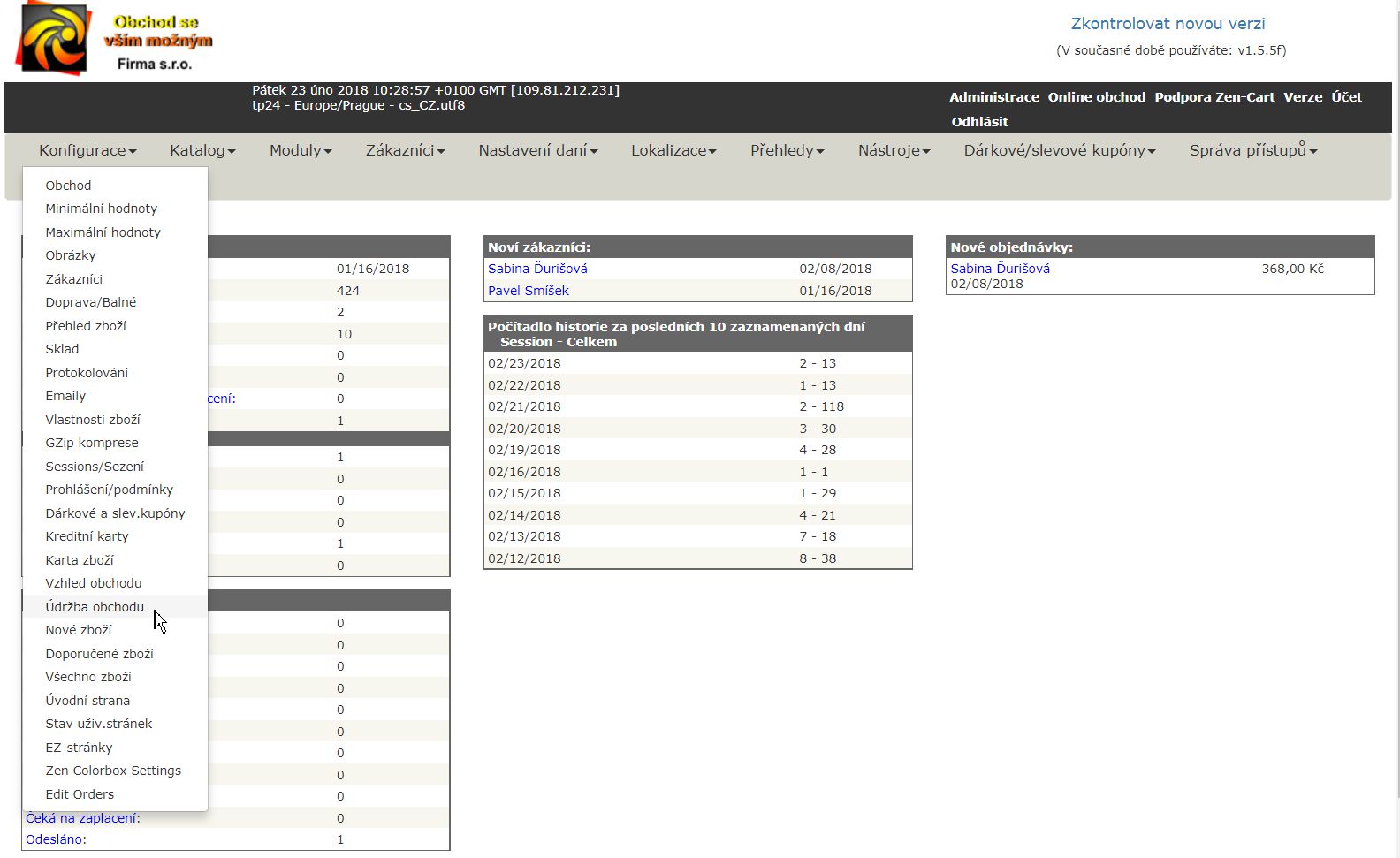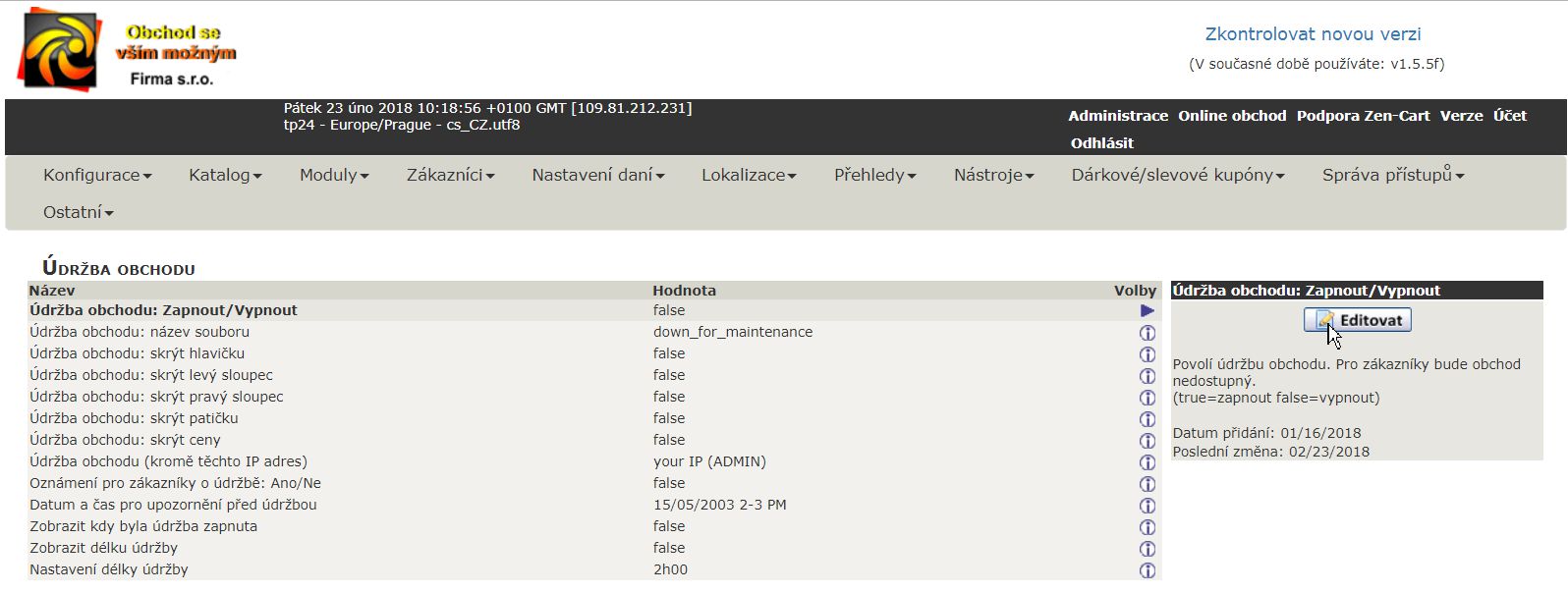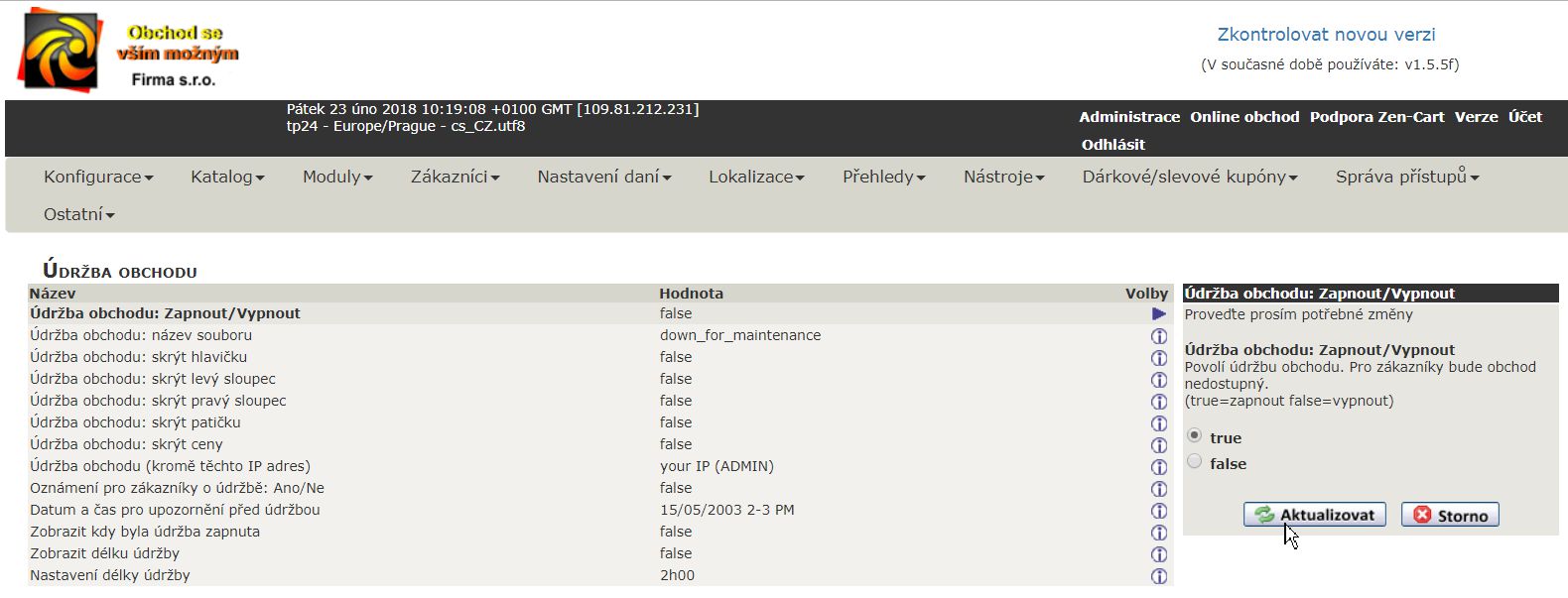 V administraci přejděte do : Konfigurace / Údržba obchodu