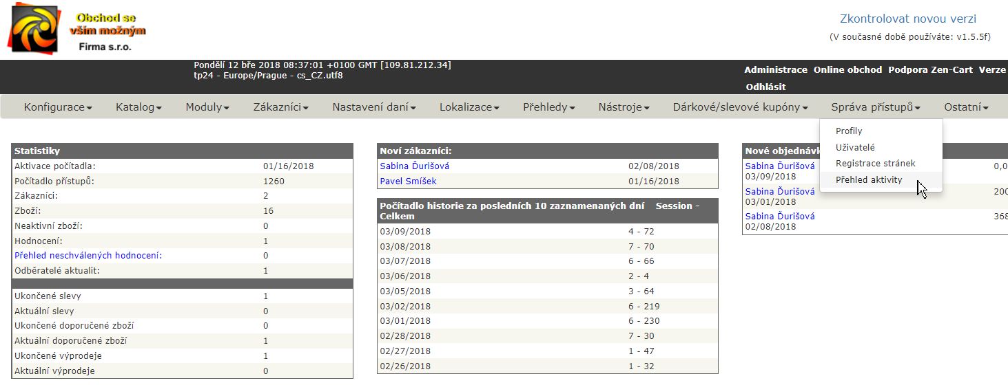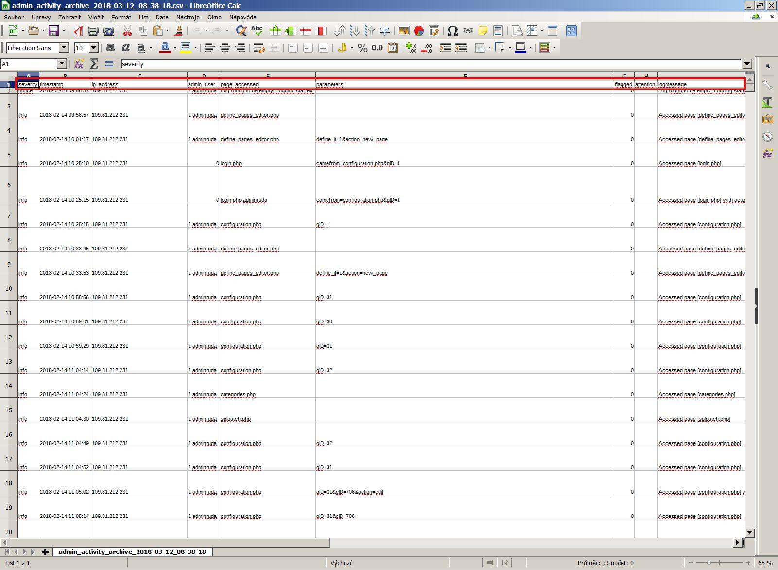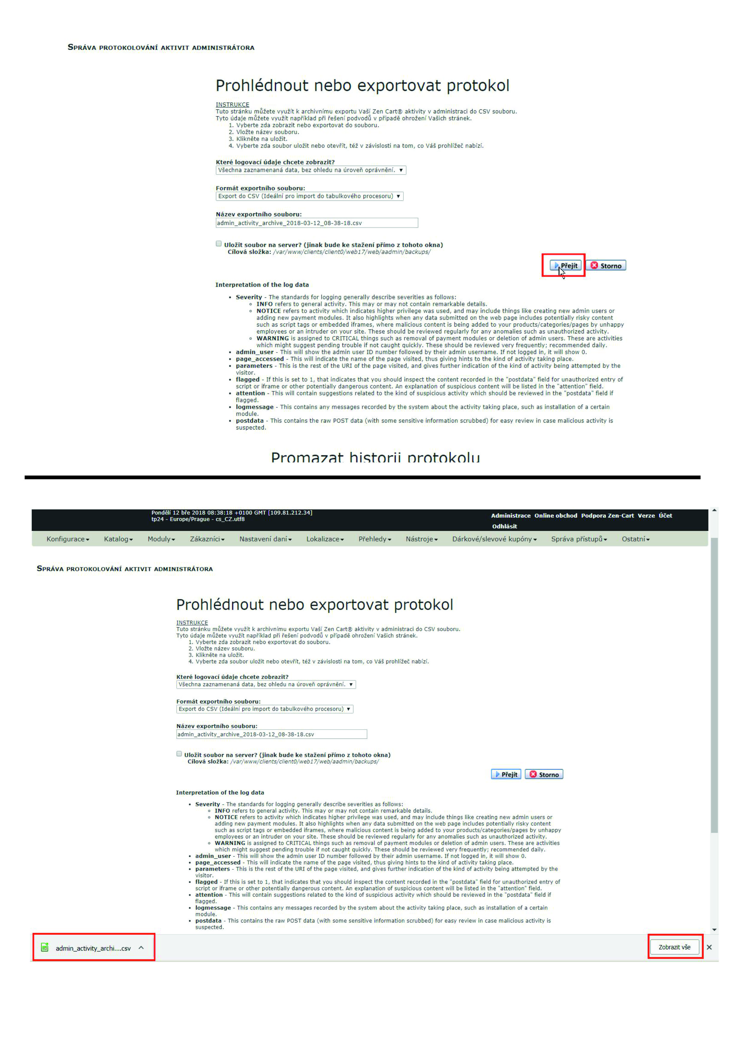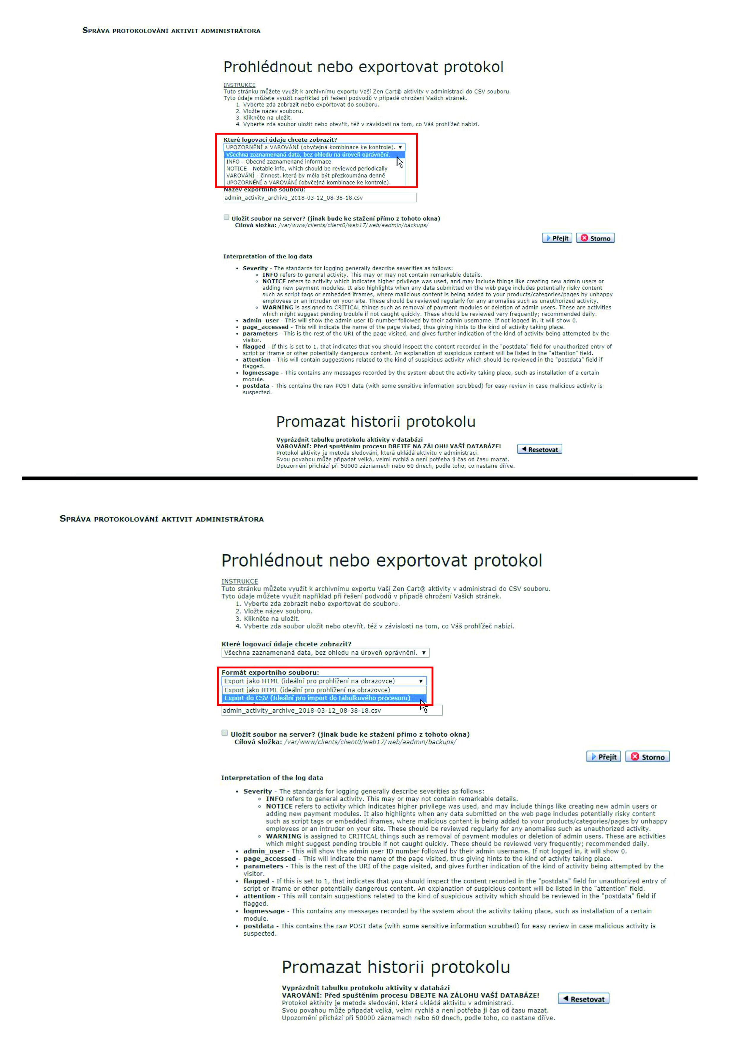 Uchovává každou navštívenou stránku administrátora. Může být použit k identifikaci porušení bezpečnosti, neoprávněnému přístupu nebo k chybám, které vytvořili jiní administrátoři.