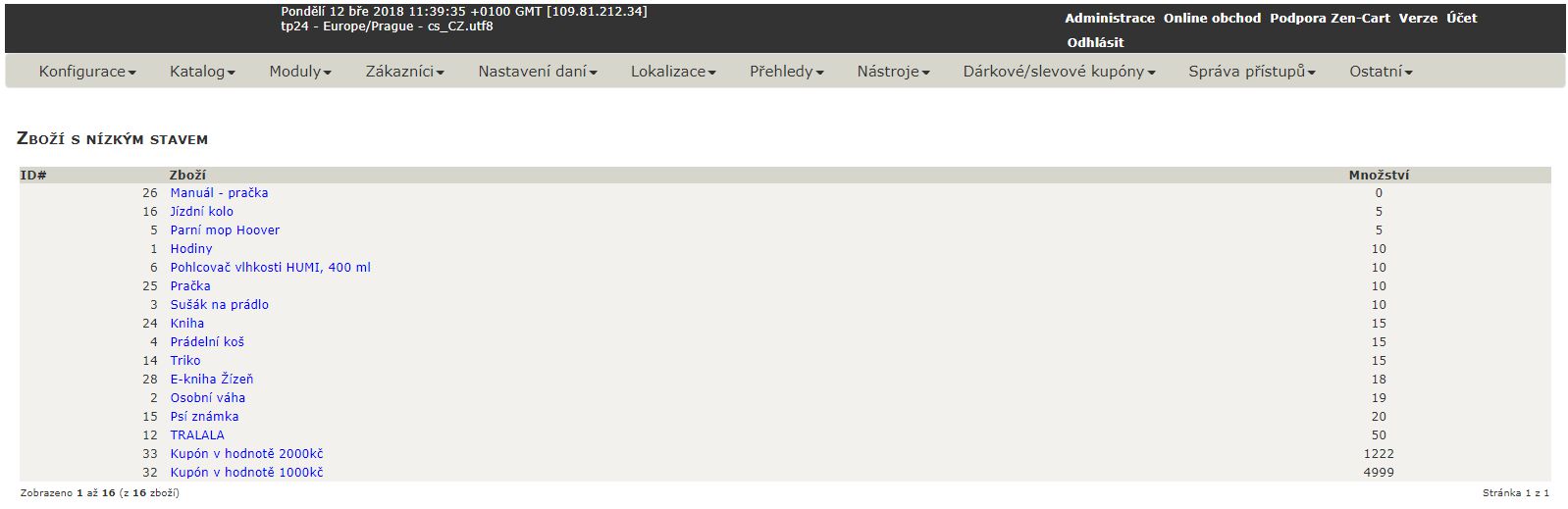 Zde se Vám zobrazí zboží s nízkým stavem.