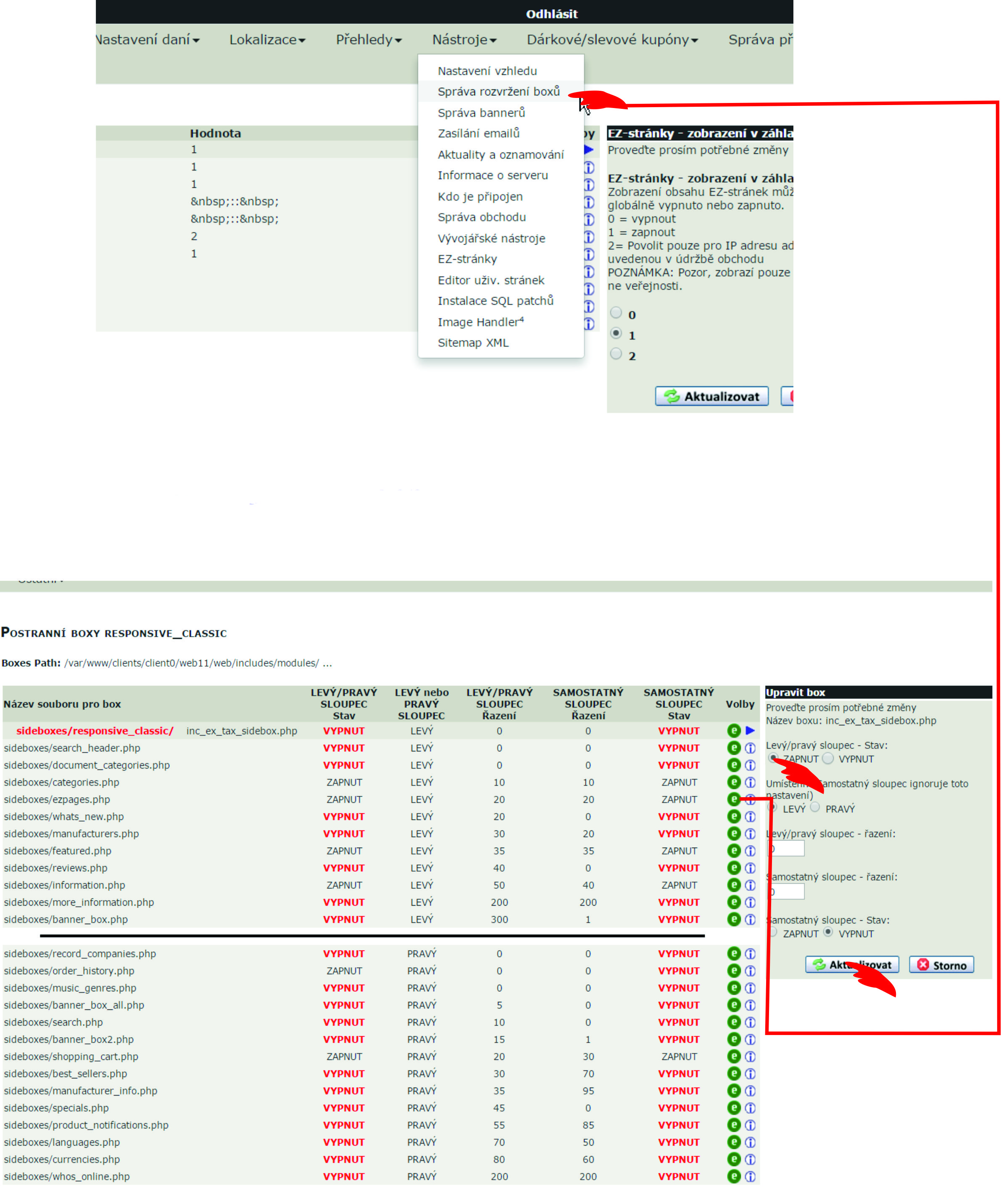 Zapnutí postranního boxu EZ- stránky