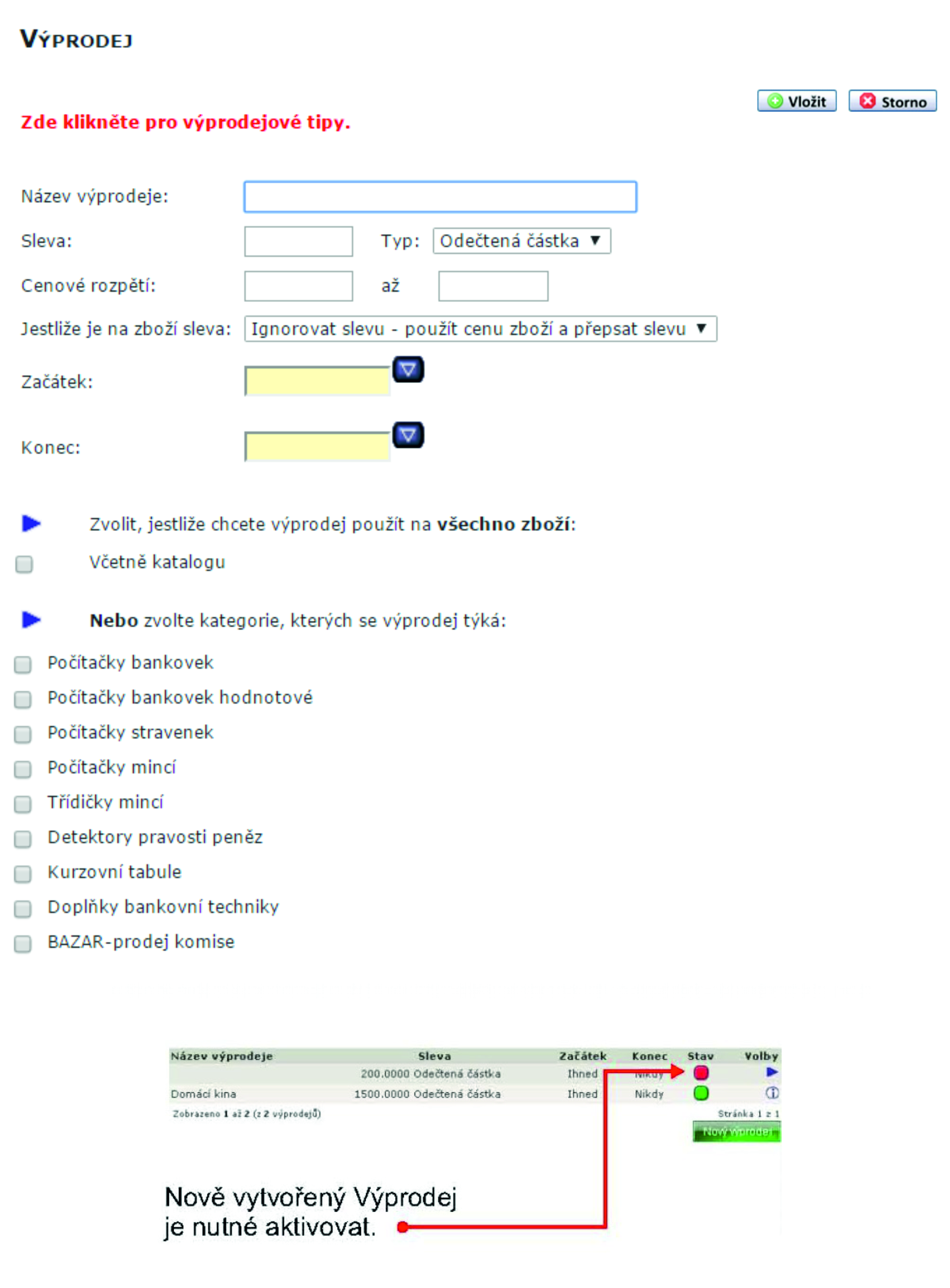 Nastavení výprodeje - Výprodej se nastavuje pro celou kategorii