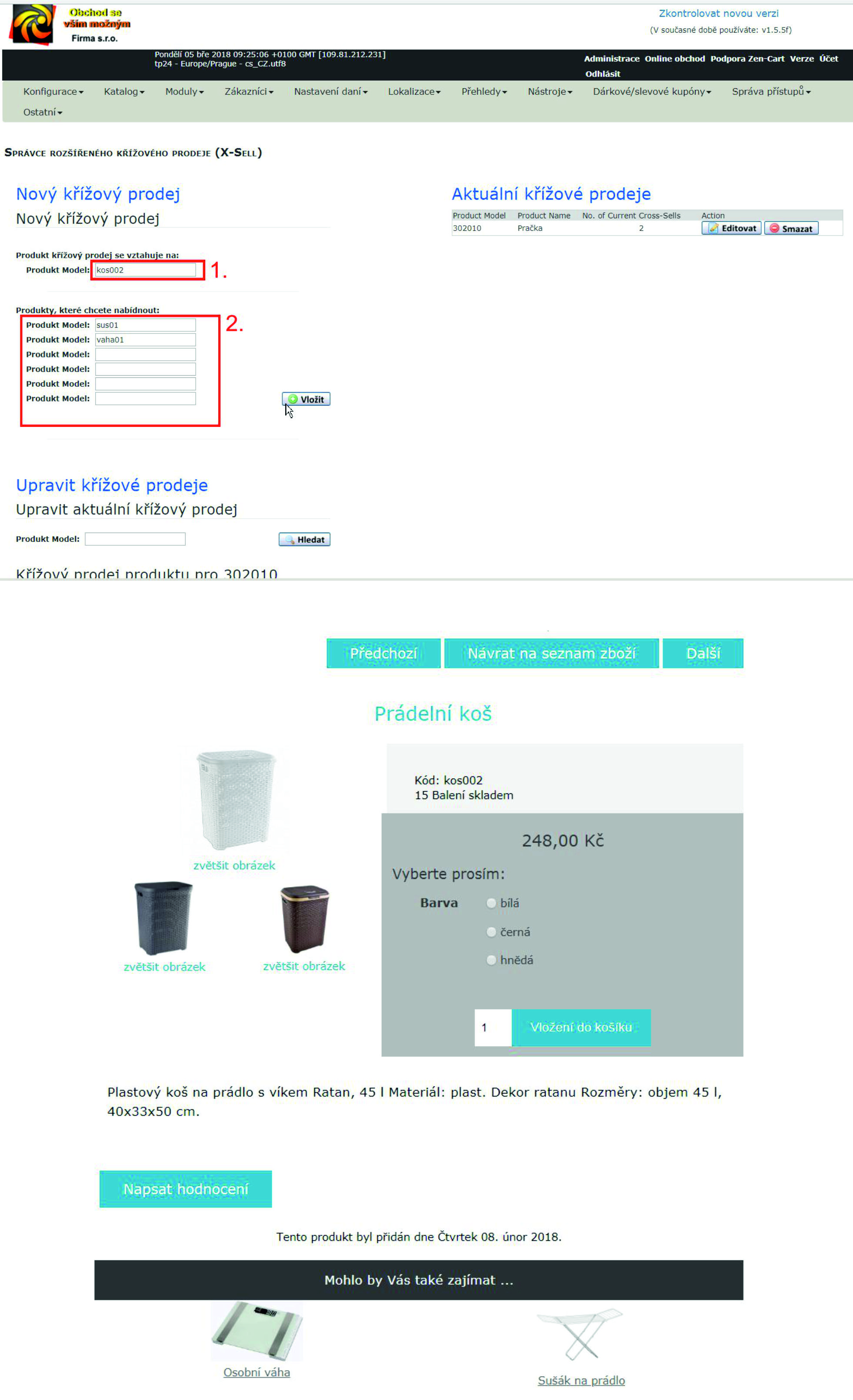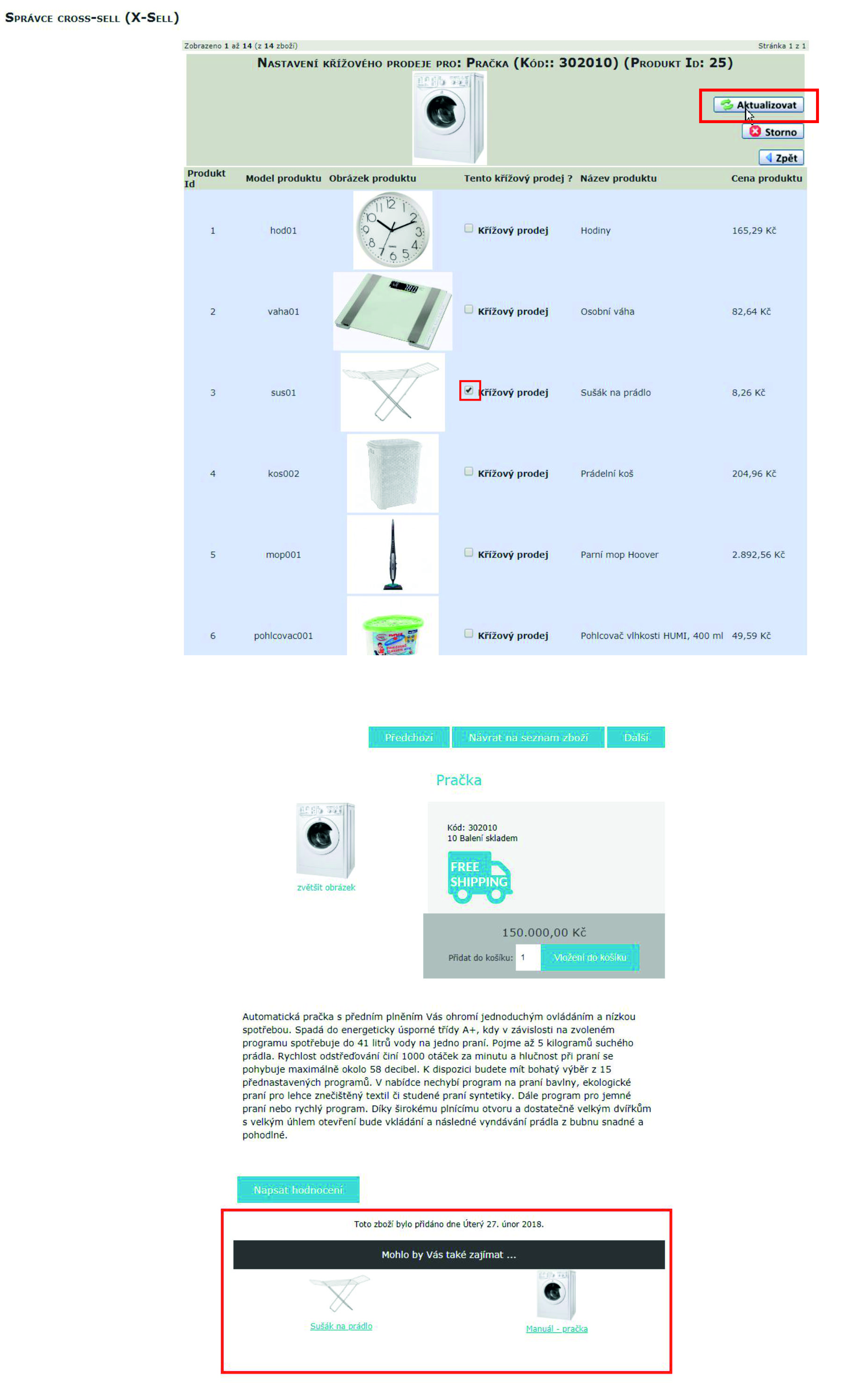 Zaškrtněte produkt/y, který/é chcete skřížit s vybraným zbožím ( např. sušák na prádlo, manuál k pračce.....) a klikněte na aktualizovat. Nyní se budou zobrazovat u zboží související produkty.